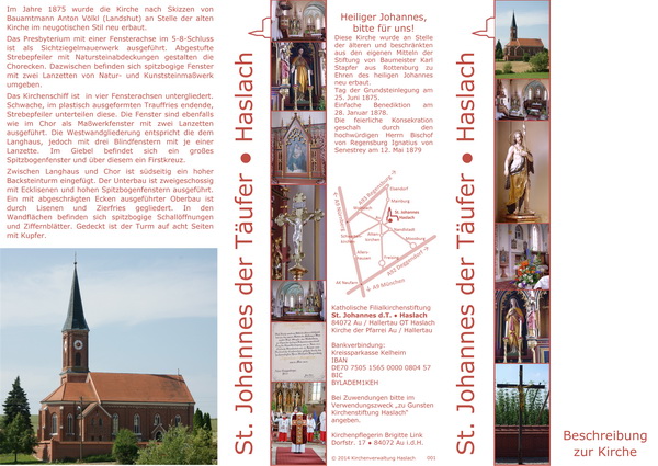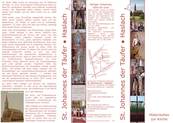 Die Kirchenverwaltung Haslach hat im Zuge der Sanierung eine Vielzahl von Recherchen angestellt. Vor allem galt es zu klären, wie die Fassade der Kirche im Ursprung ausgesehen hat. Bei der Erstellung des Schadensgutachtens sind durch den Restaurator Schlemm- und Farbreste entdeckt worden, die darauf schließen lassen, dass die Kirche einmal verputzt gewesen sein muss. Urkunden und Schriftverkehr im Bayerischen Staatsarchiv in Landshut bestätigen dies auch. Lesen Sie mehr dazu in einem der beiden Flyer.