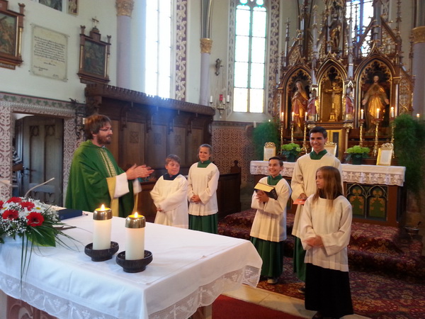 Im heutigen Abendgottesdienst in unserer Kirche bedankte sich Pfarrer Heller und die anwesende kirchliche Gemeinde mit Applaus bei unserem langjährigen Ministranten und Oberministranten Konrad, der nun in sein Berufsleben startet und sein Amt als Oberministrant an Sophia weitergibt. Zeitgleich dürfen wir Konstanze und Conner als Jungministranten herzlich begrüßen. (10.07.2015)