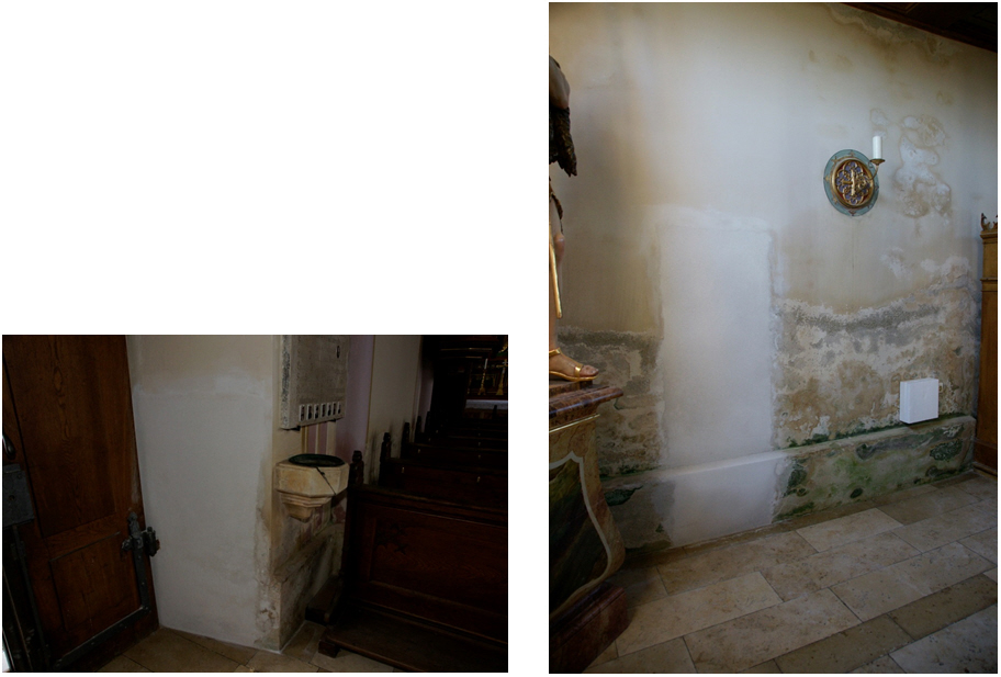 Maßnahme: An zwei Stellen in der Kirche wurde der alte Putz entfernt und durch sog. Opferputze ersetzt.